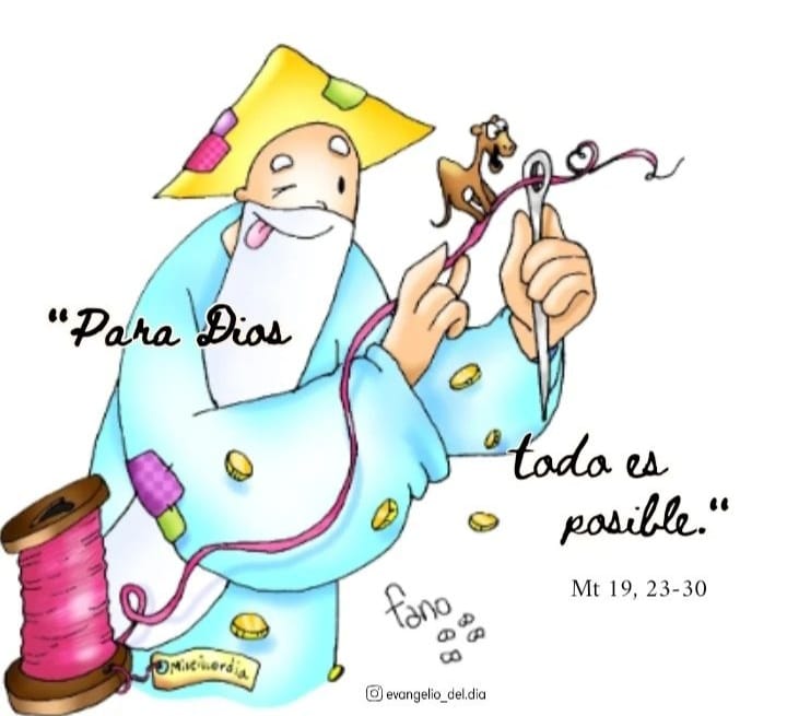 En aquel tiempo, dijo Jesús a sus discípulos: Les aseguro que difícilmente entrará un rico en el reino de los cielos. Lo repito: Más fácil le es a un camello pasar por el ojo de una aguja que a un rico entrar en el reino de Dios.Al oírlo, los discípulos dijeron espantados: Entonces, ¿quién puede salvarse?Jesús se los quedó mirando y les dijo: Para los hombres es imposible; pero Dios lo puede todo.Entonces le dijo Pedro: Nosotros lo hemos dejado todo y te hemos seguido; ¿qué nos va a tocar?Jesús les dijo: Les aseguro que cuando llegue la regeneración del mundo, y el Hijo del hombre se siente en su trono de gloria, también ustedes, los que me han seguido, se sentarán en doce tronos, para juzgar a las doce tribus de Israel.El que por mí deja casa, hermanos o hermanas, padre o madre, mujer, hijos o tierras, recibirá cien veces más y heredará la vida eterna.Muchos primeros serán últimos y muchos últimos serán primeros.